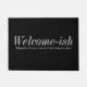 A black and white style door mat. "Welcome-ish (depends who you are and how long you stay)" Simple style design with a little sass to add to your decor.