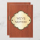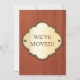 This moving announcement portrays a metal-like plaque mounted on a wooden background to mimic an engraved door plaque. The customized moving information goes within. Easily customized to make a housewarming party invitation. Available with matching products.