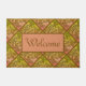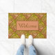 Pretty foliage doormat in with lime brown and peach. This features a delicate trailing leaf design. The background is brown lime and peach and the leaves and trellis are brown. In the center is a rectangle with Welcome in a curvy French font. But you can change this to say what you like.