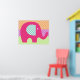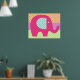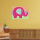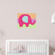 A colorful nursery poster features a bright pink elephant with teal and white dotted ears and a background with dotted orange, lavender, and green.