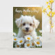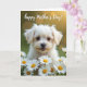 This card shows a fluffy white puppy centered in the design, looking straight out with shiny dark eyes that feel like a gentle, friendly gaze ❤️. Its mouth is slightly open with a small pink tongue showing, like a soft smile meant for someone close. Behind the pup, a green, softly blurred outdoor background is dotted with warm, golden light spots that suggest sunshine filtering through leaves. Along the bottom foreground, a thick band of white daisies with bright yellow centers forms a natural frame, adding a fresh spring touch 🌼. The contrast between the pup’s cloudlike fur and the crisp daisy petals creates a tender, affectionate scene, like a quiet moment shared between friends. Near the top, a short line of text stretches across the upper area in a thin, flowing style, set in a light color that stands out against the greenery. The letters sit above the puppy’s head without covering its face, keeping attention on the expression and the flowers. The daisies overlap slightly at the bottom edge, with a few petals angled toward the center beneath the puppy’s chin.