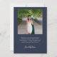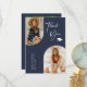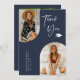 Simple and modern graduation thank you template card to send out to those who congratulated you, attended your graduation party, gave you gifts etc. Two arches for your photos with a script text that says "thank you." You can add a third picture on the back and the message is editable. The background is navy blue.