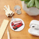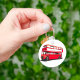 A red double decker bus out on the street. This design looks really effective on this Keychain