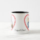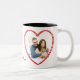 Personalized romantic Valentine mug with 2 custom photos inside of a double red heart and custom names
