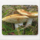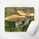 A duo of wild mushrooms pushes through the debris and detritus of the forest floor