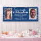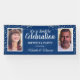 Elegant joint birthday party banner featuring a stylish blue background that can be changed to any color, 2 photos, a scattering of party silver confetti glitter, and a modern double celebration template that is easy to personalize.