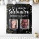 Elegant joint birthday party tapestry featuring a stylish black background that can be changed to any color, 2 photos, a scattering of party gold confetti glitter, and a modern double celebration template that is easy to personalize.