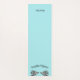 Robin's egg blue yoga mat with graphics of two gray and blue pigeons facing each other. Black arched text, above the birds reads, Double Pigeon (yoga pose). The other end of the mat has black custom text, personalize to suit your needs.