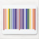 Geometric barcode design features two rainbows made of pairs of colored stripes that correspond to UPC numbers. Getting my geek on, the numbers correspond to the letters in "rainbow" to make a double rainbow. Since barcodes are only 12 numbers long, I let the "r" be represented by the red start and middle stripes. The sequence starts on the left with red, orange, yellow, green, blue, indigo, and violet. Two stripes of red serve as a divider in the middle and then the colors go from violet back to red for a balanced look.