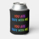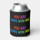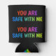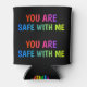 Stay chill and stay loud with this bold **"You Are Safe With Me"** beverage cooler from Sarendestini Designs. The design repeats on both sides so no matter which way you hold it, the message is seen. Set on a sleek black background with the **PrideVibe logo** at the bottom, this can cooler is a powerful, portable declaration of allyship, safety, and pride. Perfect for festivals, pride parades, or everyday support.