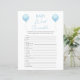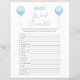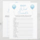 This double sided game card features word scramble on the front and bingo on the back, and is perfect for a baby shower or baby sprinkle. This word scramble bingo game features a blue watercolor balloon. You can personalize this design by clicking on "Personalize this template" or if you wish to change the font, colors or arrange the design elements in a different way you can click on "Edit using Design Tool". Answer Key: 1. Diaper 2. Bassinet 3. Bottle 4. Crib 5. Pacifier 6. Changing Table 7. Stuffed Animal 8. Stroller 9. Rubber Ducky 10. Blanket 11. Teether 12. Formula 13. High Chair 14. Mobile 15. Thermometer 16. Baby 17. Milk 18. Booties 19. One-sie 20. Teddy Bear