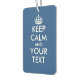 Custom keep calm and your text car air freshener. navy blue or custom color. Create your own funny keep calm and carry on parody design. Vintage keepcalm typography template with crown. Humorous examples: Keep calm and party on. Keep calm and sparkle on. Keep calm and drink coffee. Refresh your vehicle with different cool auto scents to mask dog / pet smell and other dirty stinky odors. Unique novelty gift idea for men and women. Design your own for dad, mom, mother, father, uncle, grandpa, brother, son, sister, wife etc. Custom air refreshener with customizable keepcalmandcarryon text. Make it smell like a fresh new car, black ice or the sea. Double sided design. Make your own slogan, spoof or saying.