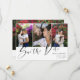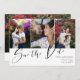 Double sided save the date card with three photos in a clean collage on one side and a larger photo on the other. Save the Date is written in a looser calligraphy style. Add your names and wedding information. On the back, you can add your wedding website too.