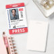 Vertical press ID with red and blue as accent colors. Add photo, logo, name, title, ID number and more.