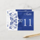 This romantic royal blue and white floral double-sided table number post card has a blue PRINTED ribbon and bow with a pair of PRINTED diamond jewel and blue FAUX glitter joined hearts on it that matches the wedding invitation shown below. You must customize the card for EACH table number that you need, by changing the "11" to each number you need, adding it to your cart, and then repeating the process until you have the correct number of individual cards in your cart. If you have any questions, email niteowlstudio@gmail.com.