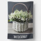 This double sided house flag with a white wicker basket filled with sweet lily of the valley flowers is a charming way to welcome your guests.
