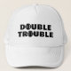 DOUBLE TROUBLE tennis trucket hat for team players. Sports cap for men women and kids (boy or girl) playing together. Cool gift ideas for doubles team, tennis coach, player, high school team and fans. Tennis ball design with modern typography. Tennis humor quote. Sun protection caps for him and her.