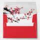 A wedding invitation envelope featuring falling red leaves/flowers with a double xi character.