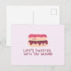 The postcard features an adorable illustration of two doughnuts, one on top of the other. The top doughnut is frosted with a glossy pink glaze and sprinkled with colorful sprinkles, while the bottom doughnut has a rich chocolate glaze. Both doughnuts are anthropomorphized with cute faces; the top one appears to be smiling with its eyes closed, radiating contentment, and the bottom one, with a simple yet endearing smile. Below the illustration, there's a heartfelt message that reads "LIFE'S SWEETER WITH YOU AROUND" in a casual, handwritten font. The background is a soft, pastel purple, contributing to the overall sweetness and charm of the design. This postcard is perfect for expressing affection, gratitude, or just to bring a smile to someone's day.