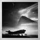 A Douglas Dakota of BOAC at Gibraltar, silhouetted by searchlights on the Rock.