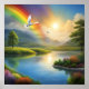 An image of a dove flying over a serene landscape with a rainbow in the sky.