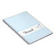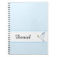 Custom name notebook is shown in a light blue color with a accent strip with a dove print and a sample name.