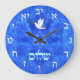 Features "shalom" (Hebrew "peace") and a dove carrying a bit of olive branch in its beak on a nice blue and white fractal background which is reminiscent of birds wings. The hours are designated with Hebrew letters.