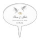 This wedding cake topper is shown with a doves and rings print. Text of bride and grooms names, wedding date and the phrase "Together As One ". Text shown in Black.