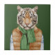 This design features a tiger winter ready wearing his down vest, green knit scarf and Christmas sweater.