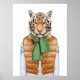 This design features a tiger winter ready wearing his down vest, green knit scarf and Christmas sweater.