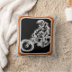 A downhill mountainbike and rider. The bike is drawn in grey, using "white space" technique on a black background. The rider is going down hill and is given perspective by the front wheel of the bike looking larger (closer) than the rear.