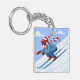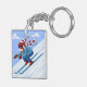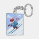 A downhill skier skiing down the slopes. This design looks really effective on these Keychain