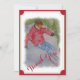 Thank you card featuring a Downhill Skier wearing a red jacket, blue jeans, gold goggles racing down a snow powdered hill - can be customized - Skier has been painted in watercolors by the designer