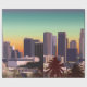 Colorful vector illustration featuring a gorgeous skyline dominated by skyscrapers and palm trees from downtown Los Angeles with a beautiful Californian sunset in the background.
