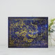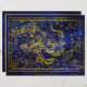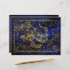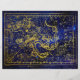 Beautiful digital art features dozen of celestial constellation illustrations including prominent Draco, in gold on night blue starry sky background. Same image on both sides