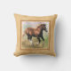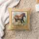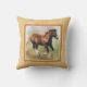 A square throw pillow or cushion with a border frame in shades of beige and light tan, with a digital painting of a cantering sorrel draft horse foal on a pastel colored background.