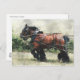 An oil painting effect design made from a photo of two bay draft horses with feathered legs, in harness.