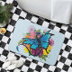 Black and blue dragon with blue butterfly wings nestled amongst a bouquet of colourful flowers in a backdrop of light blue