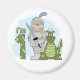 This fantasy theme kids first birthday design features a cute knight in shining armor with sword and his trusty (trusty?) little green dragon, with a large number 1.
