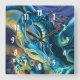 Dragon Rider art is a dramatic fantasy painting by Traci Van Wagoner featuring a blue green dragon in a dramatic flying pose with a rider in red holding a staff high on his back with a child rider behind. Anyone who loves dragons and fantasy art will love this artwork.