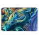 Dragon Rider art is a dramatic fantasy painting by Traci Van Wagoner featuring a blue green dragon in a dramatic flying pose with a rider in red holding a staff high on his back with a child rider behind. Anyone who loves dragons and fantasy art will love this artwork.