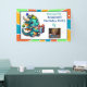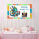 Blue, green, yellow and orange dragon themed boy's birthday party personalized photo banner. Cute for any little boy who loves dragons! Cute cartoon dragons in birthday hats holding birthday cakes.