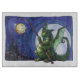 If you love dragons, you'll love this fun Dragon Watch Artwork painted by Traci Van Wagoner. This fantasy illustration depicts of a green dragon holding a yellow paper lantern at night silhouetted against a full moon with a castle behind. Leading up to the castle in the background is a line of dragons carrying lanterns. I love dragons, night scenes, and the idea of dragons on guard. Dragons rule!