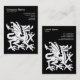A business card template with a bold heraldic dragon symbol. Company name, business type and address on the front with name, job title, telephony, web and email addresses on the back, with the same layout.