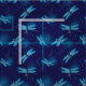 Beautiful whimsical nature pattern of blue dragonflies and swirls over a midnight navy blue background