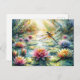 This postcard features a dragonfly gliding over a tranquil pond filled with blooming lotus flowers and lush lily pads. The nature-inspired scene glows with soft sunlight and vibrant botanical detail. Shades of pink, peach, lavender, green, and golden yellow blend beautifully, capturing the magical stillness of a summer morning by the water.