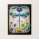 This is a bold painting, full of glints of 'gold'! In the center is a dragonfly, with lots of stylized flowers surrounding it. Shades of teal, purple, gold, blue, red, yellow, orange. Signed, original art.