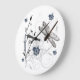 Beautiful wall clock with flowers and dragonfly design. White background with artwork in shades of blues, greys and black and brown. Says "Dragonfly Love" Design works best on this size clock.