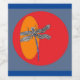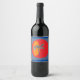 pretty and detailed drawing of a single blue dragonfly on a big red circle with an orange oval inside makes a bold and unique wine label.