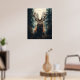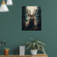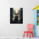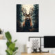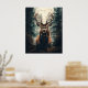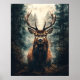 A powerful and dramatic scene of an elk standing proudly in the woods, its majestic antlers towering above the dense forest. The deep shadows and misty atmosphere around the elk create a sense of mystery and strength, capturing the raw beauty of nature.